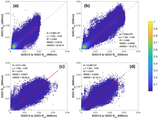 Scatterplots of the adjusted GOCI-II Rrs versus GOCI Rrs for bands at (a) 443 nm, (b) 555 nm, (c) 660 nm, and (d) 680 nm. The color bar depicts data density on a logarithmic scale, visually depicting the alignment of the GOCI-II Rrs with the GOCI Rrs across the examined spectral bands.