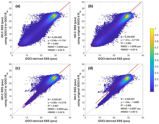 Our approach incorporated the application of an established equation for deriving the SSS from the GOCI data, as detailed in previous research [8] (hereafter, Choi’s equation), alongside a machine learning model. This process was to ensure that the Rrs data from the GOCI-II was compatible with that of the GOCI. We then evaluated the correlation between the SSS estimates obtained from the GOCI and those derived from the GOCI-II (Figure 2). Through this methodology, we identified two distinct SSS estimations from the GOCI-II: