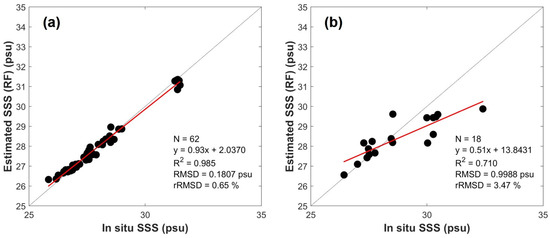 Modeling results from the random forest (RF) model, using in situ data for calibration (a) and validation (b), demonstrating the model’s performance in estimating SSS.