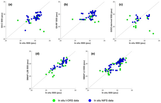 Scatterplots comparing in situ data with the GII-C SSS (a), GII-RF SSS (b), GOCI-derived SSS (c), SMAP L2B SSS (d), and SMAP L3 SSS (e), distinguishing between I-ORS data (green circles) and NIFS data (blue circles).