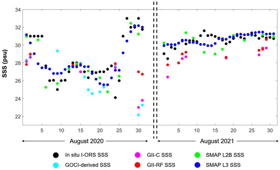 The daily SSS comparison between the in situ I-ORS data and various satellite-derived SSS products for August 2020 and 2021, with the X-axis marking the days of August.