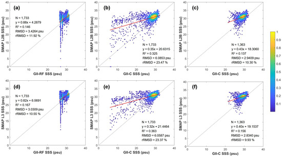 Scatterplots comparing the GOCI-II-derived SSS with the SMAP L2B SSS (a–c) and SMAP L3 SSS (d–f), covering all pixels from August 2020 to 2021. (a,b,d,e) include the entire dataset, whereas (c,f) focus specifically on pixels from GOCI-II data not classified as turbid. The color bar depicts data density on a logarithmic scale.
