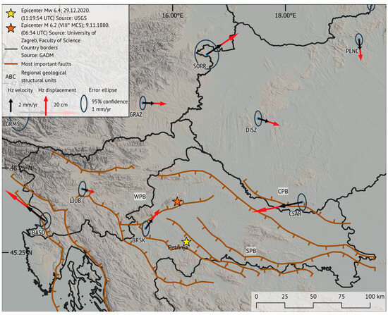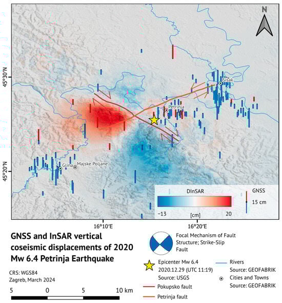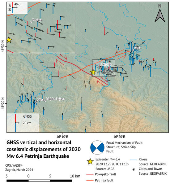 GNSS-derived coseismic horizontal and vertical displacements. Black arrows and blue and red bars denote GNSS horizontal and vertical displacements, respectively. The apparent motion of the Pokupsko and Petrinja fault caused by the 2020 Petrinja earthquake is depicted, with fault structures modified after Fuček et al. [41].