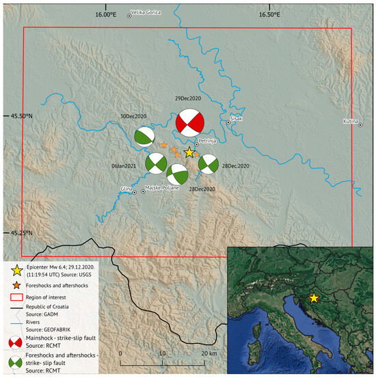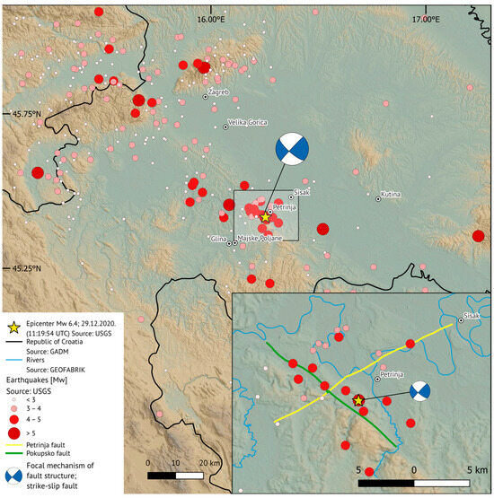- Baize, S.; Amoroso, S.; Belić, N.; Benedetti, L.; Boncio, P.; Budić, M.; Cinti, F.; Henriquet, M.; Jamšek Rupnik, P.; Kordić, B.; et al. Environmental effects and seismogenic source characterization of the December 2020 earthquake sequence near Petrinja, Croatia. Geophys. J. Int. 2022, 230, 1394–1418. [Google Scholar] [CrossRef]