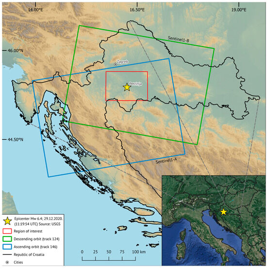 The main objective of this article was to investigate ground surface displacement in the wider Petrinja area due to the 2020 earthquake that took place near Petrinja on 29 December, with the epicenter 2.5 km SW from Petrinja, 12 km SW from Sisak, and 15 km SE from Glina [18] (USGS; https://www.usgs.gov/, accessed on 1 March 2024). The study area is shown in Figure 5.