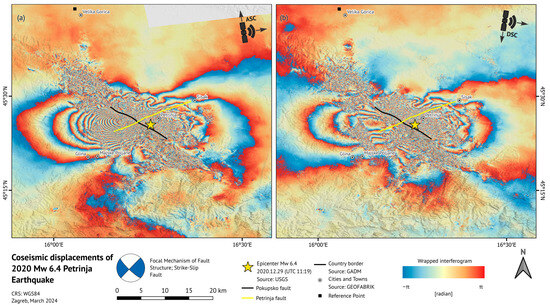 One pair of SLC Sentinel-1A images and one pair of SLC Sentinel-1B images were processed with the Interferometric synthetic aperture radar Scientific Computing Environment (ISCE) software (version 2.6.3) [44] to generate coseismic ascending and descending interferograms of the 2020 Petrinja earthquake. Coregistration of images was based on precise orbits and a 1 arc sec Shuttle Radar Topography Mission (SRTM) digital elevation model (DEM) [45]. The SRTM DEM was also used to remove flat-earth and topographic phase terms from the images and to geocode them. An adaptive power spectrum filter [46] with an alpha value of 0.9 was used to lower phase noise and to improve measurement accuracy and phase unwrapping. A multilook ratio of 14:4 was applied in both the range and azimuth directions to achieve approximately 50 m pixel posting of the geocoded interferograms. Subsequently, the wrapped interferograms underwent unwrapping using the minimum cost flow (MCF) SNAPHU algorithm [47] to remove the 2π moduli. Post-processing involved geocoding interferograms to the WGS84 (EPSG: 4326) coordinate system with the use of the SRTM DEM and the application of the Global Atmospheric Correction Online Service (GACOS) [48,49,50] for InSAR to mitigate tropospheric phase artifacts. Following this, a point at coordinates 45.73°N and 16.06°E in the WGS84 coordinate system (EPSG:4326) was chosen as a common unwrapping reference point. This reference point exhibited a coherence greater than 0.99 and was situated in the far field of the earthquake deformation zone, experiencing negligible displacement.