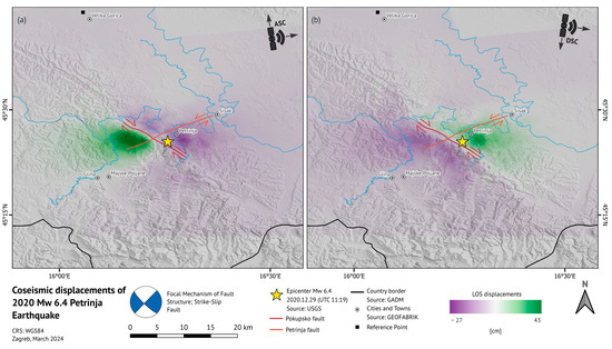 Sentinel-1A and B LOS displacements of (a) ascending orbit (path 124) and (b) descending orbit (path 146). The common reference point used for phase unwrapping in post-processing is denoted as a black square. The apparent motion of the Pokupsko and Petrinja fault caused by the 2020 Petrinja earthquake is depicted, with fault structures modified after Fuček et al. [41].