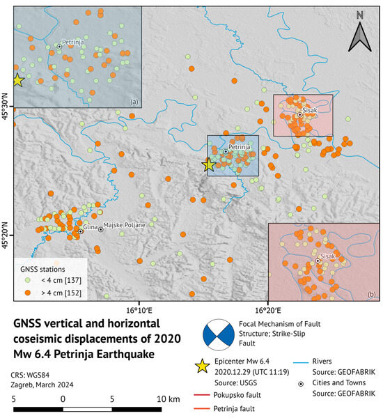 - Henriquet, M.; Kordić, B.; Métonis, M.; Lasserre, C.; Baize, S.; Benedetti, L.; Spelić, M.; Vukovski, M. Rapid Remeasure of Densce Civilian Networks as a Game-Changer Tool for Surface Deformation Monitoring: The Case Study of the Mw 6.4 2020 Petrinja Earthquake, Croatia. Geophys. Res. Lett. 2022, 49, e2022GL100166. [Google Scholar] [CrossRef]