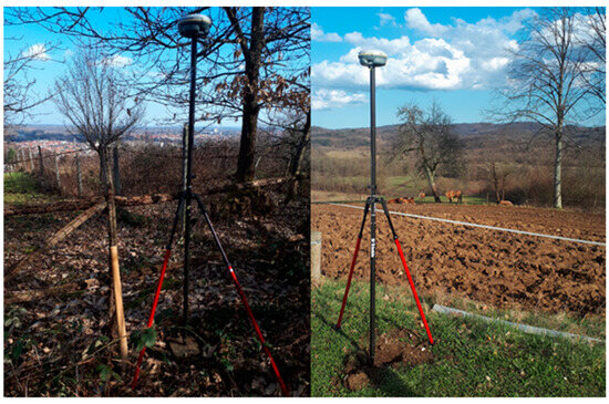 Field measurements in the wider Petrinja area on 20 February 2021 (left) and in Drenovac Banski on 13 March 2021 (right). All stations of low-order GNSS and trigonometric networks that were observed are stabilized with concrete 20 cm × 20 cm × 60 cm columns with one underground center.
