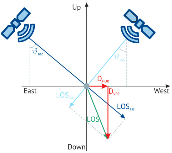 By employing a combination of two independent acquisition modes, both horizontal and vertical displacements can be retrieved from InSAR LOS measurements. Figure 11 and Equation (1) indicate the relationship between the acquisition geometry (incidence angle (ϑ) and azimuth angle (α) of a satellite orbit) and the LOS measurements from ascending and descending orbits [55]: