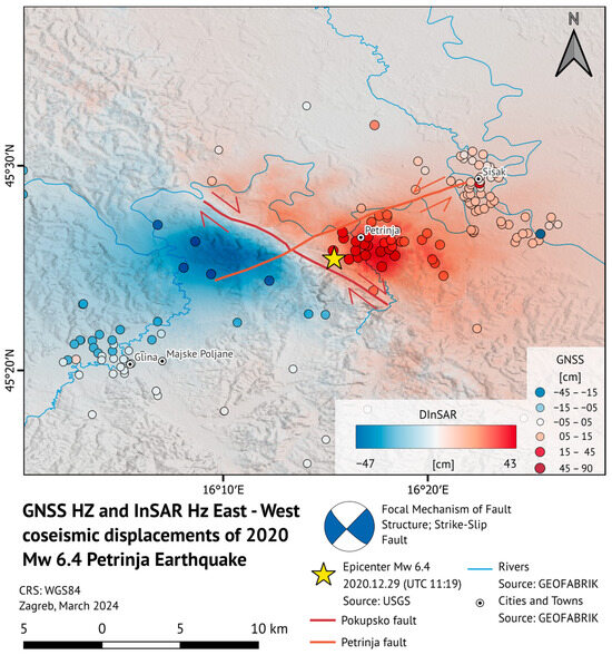 The overlap of derived coseismic InSAR and GNSS horizontal motion in the east–west direction is illustrated. The apparent motion of the Pokupsko and Petrinja fault caused by the 2020 Petrinja earthquake is depicted, with fault structures modified after Fuček et al. [41].