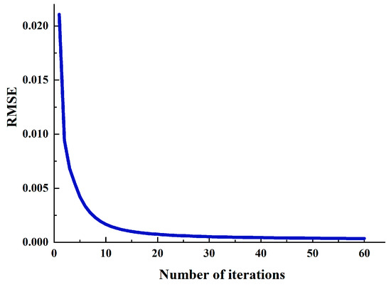 (3) The residual between the GRACE observed mass anomaly and the forward modeling mass anomaly is added to the initial mass anomaly. In previous studies, a scale factor of 1.2 is recommended, which can accelerate the convergence of the iteration, that is, . Here, we choose 1.2 as the scale factor according to the data experiment. The new initial mass is repeated for the second step until the difference is less than a certain threshold or after a certain number of iterations. Unlike the large regions with apparent TWS variation, the number of iterations of the medium regions adjacent to weak TWS anomaly areas is smaller. In this research, we set the number of iterations to 20 according to the convergence curve depicted in Figure 2.