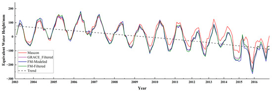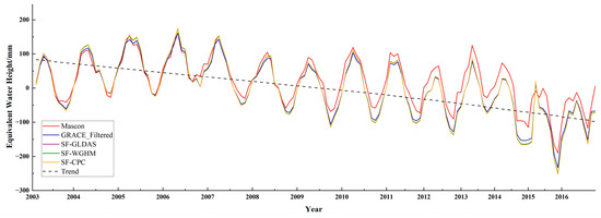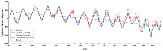 The noise that existed in the SHCs was suppressed by amounts of filters that attenuated the signal as well. Moreover, the regional average process for basin scale research also dampens the signal’s amplitude. The leakage error has generally been divided into two types. One type is the “leakage-in” error, caused by signals from adjacent areas leaking into the one of interest. The other type is the “leakage-out” error, which signals leakage opposite to the “leakage-in” error [12]. In this work, we recognized leakage error as the discrepancy between the recovered results followed by the methods described in Section 3 and the reference results derived from Mascon products.