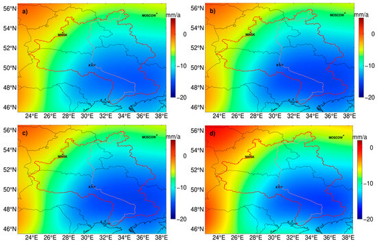 Figure 3 shows the trend of TWS anomaly recovered by the FM approach described in Section 3.2 in the spatial domain. Comparing the (a) and (b) in Figure 3, the declined source of mass change rate after 10 iterations of the FM approach is more concentrated in the south of the Dnieper River basin. After the filtering process that is the same as that of GRACE, the recovered mass rate (c) is −12 ± 1.44 mm/a, close to the initial mass rate (a). Though (a) and (c) have the characteristic of boundaries both at the values of −5 mm/a and −10 mm/a, those forms of expression vary. For Figure 3a, the mass rate changes in a fan region formed by the boundary, while for Figure 3c, the mass rate varies in ring regions formed by the boundaries. In Figure 3c, boundaries tend to converge. In other words, the leakage error effect is converged behind the FM approach’s correction. The residuals between the initial mass rate and the filtered mass rate are depicted in (d) of Figure 3 to analyze the effect of the FM approach. As (d) shows, most of the region in the Dnieper River basin has mass rates close to zero. According to the features of convergence and residuals, we may reasonably confirm that the leakage effect influenced the south region of the Dnieper River basin. The main reason is a long TWS decline combined with the weak TWS variation region, the Black Sea, adjacent to the south of the Dnieper River basin.
