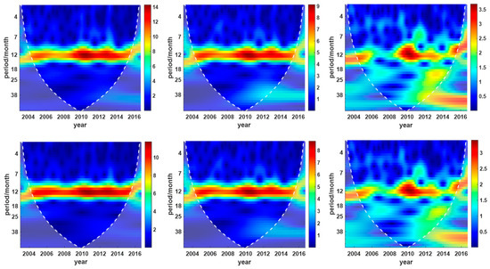 The XWT of time series between GRACE time series of TWS anomaly and three-time series of TWS anomaly simulated from hydrological models. The first row is the results of XWT that GRACE filtered time series with unfiltered time series derived from WGHM, GLDAS, and CPC models; the second row is the results of XWT that GRACE filtered time series with filtered time series derived from WGHM, GLDAS, and CPC models.