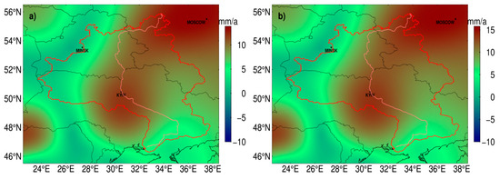 Following the general procedure, the C20 coefficient is replaced by independent measurement from satellite laser ranging (Technical Note TN-11) [41]. The degree 1 coefficients have been replaced by estimations using the method of Sun et al. (Technical Note TN-13) [42]. Next, the glacial isostatic adjustment (GIA) effect is removed with the method suggested by Geru A et al. due to the Dnieper River basin being located in an area influenced by the last glacial period [43].