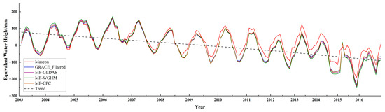 The time series in Figure 10 were disposed of as in Section 4.1 again for analyzing the efficiency of the multiple factor approach based on three hydrological models. From 2003 to 2006, the phase shift caused by the phase difference calculation of the data-driven approach is not seen. However, the trend of separation between the ‘true’ time series and the ones corrected by the WGHM and GLDAS models is also apparent. This anomaly results from the conclusion that the leakage error does not mainly come from the trend term. For the rest, the time series, including filtered and recovered, appear in fine agreement with the ‘true’ time series. The semi-annual term is magnified maximally with the factor 1.14, compared with the rest of the seasonal terms derived from CPC models. The results indicate that the leakage error comes mainly from the semi-annual term of TWS anomaly.