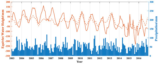 Usually, the TWS anomaly detected by GRACE is closely related to precipitation in the river basin. For analysis and verification, the precipitation in the Dnieper River basin from GPCC products is introduced. The precipitation data from the Global Precipitation Climatology Center (GPCC) are constructed based on 124,000 in situ measuring stations distributed worldwide [52]. All GPCC products are available in spatial resolutions of 1°, 0.5°, 0.25°, and 2.5° latitude and longitude, as well as the temporal resolution of the month [53]. In the paper, we adopt the data sets from 2003 to 2016 in 1° spatial resolution.