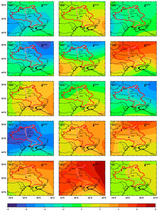 Making a general view of all data experiments, the common, more significant deviation existed in 2015, which has not been discussed and interpreted. It needs to be emphasized that the time series of GRACE in Figure 11 is obtained by interpolation for the data of missing months to match with the time of the CPC. As mentioned above, the situation in 2015 is within the period of declination of TWS anomaly. This case and the trend of decline are also analyzed together in terms of temperature. The temperature anomaly of February is shown in the spatial domain, considering the peaks that appear every year and the alternating months of winter and spring. From Figure 12, the temperature anomaly approaches or falls below 0 °C from 2003 to 2007 and 2010 to 2012 and above 0 °C from 2008 to 2009 and 2013 to 2016 in the Dnieper River basin. The variations in temperature anomaly relative to the long-term mean of February from 2003 to 2016 influences the TWS anomaly by the mechanism that high temperature leads to snowmelt and increased runoff and evaporation. According to the water balance equation, the temperature effects propagate to TWS change, representing an increasing or decreasing trend that is contrary to temperature anomaly. Therefore, it is reliable to consider the TWS anomaly decreasing trend derived from GRACE data sets influenced by the temperature to a certain extent.