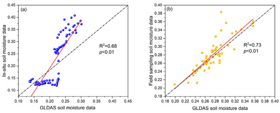 To validate the soil moisture from GLDAS data, the in situ soil moisture data from the eddy-covariance flux tower and field sampling data were used to evaluate the applicability of the GLDAS data. The results (Figure 2) showed that the coefficients of determination (R2) between the GLDAS data and in situ or field sampling data were 0.68 (p < 0.01) and 0.73 (p < 0.01), respectively. The results indicated the high performance of the soil moisture from GLDAS data in the study area.