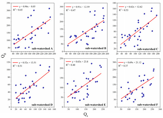 The model was validated using observed growing season runoff data from six subwatersheds, and the validation results are shown in Figure 3, where Qs is the flow obtained from the simulation and Qg is the measured flow during the growing season. Among the six subwatersheds, the growing season runoff from 1982 to 2012 simulated with the improved model fitted well with the measured growing season runoff, with the R2 value varying from 0.37 to 0.53. In subwatersheds with a larger area, the fit was better, and the fit for subwatersheds C and D was better when compared to that for the other smaller subwatersheds. When compared to our previous studies [23,38], the simulation accuracy of the runoff term in our model was improved. Figure 4 shows that the multiyear average growing season runoff from 1982 to 2012 was generally consistent with the fit to the measured growing season runoff (R2 = 0.99), which we used as the input for the runoff term in the coupled ecohydrological model.