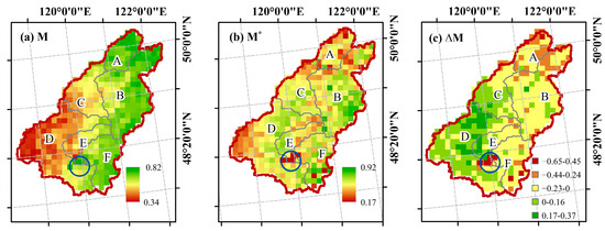 Notably, the optimal vegetation coverage of each subwatershed was lower than its actual vegetation coverage; therefore, the water stress of the watershed must be considered. On the basis of the ∆M values, it was found that 67.23% of areas had optimal vegetation coverage that was lower than the actual vegetation coverage, with values varying between −0.65 and −0.01. Areas where the optimal vegetation coverage of the watershed was lower than the actual vegetation coverage are mainly located in the eastern part of the watershed in mountainous forested areas, namely subwatersheds A (−0.26), B (−0.16), E (−0.11), and F (−0.13), whereas the areas where the optimal vegetation coverage of the watershed was greater than the actual vegetation coverage are mainly located in the southwestern steppe zone, namely subwatersheds C (−0.07) and D (−0.02). Subwatershed A had the greatest actual vegetation coverage in the entire watershed, but the optimal vegetation coverage was notably smaller than that of the other areas, indicating that subwatershed A had the most severe water stress problems. The area encompassed by the blue circle in Figure 5 is the Huihe Forest, where M (0.82) is much larger than M* (0.17). This region is in the forest–grass transition area, which is relatively arid. Owing to recent ecological restoration projects, water consumption in this region has been increasing and water supply/demand problems have become serious. The blue circle is the location of planation forests in Hui River, which exhibited a large difference between M and M*. The results are likely because of the excessive afforestation in the area during recent years.