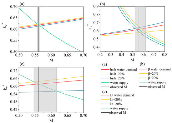 The value of M* changes with vegetation parameters, which include the cosine of the angle that the leaf surface makes with the horizon (), the foliage area index (), and the ratio of the height of the trunk to the height of the individual plant () (Figure 6). When increases (decreases) by 20%, the water demand curve shifts upward (downward), resulting in a decrease (increase) in M* by 0.61% (0.72%). Notably, an increase or decrease in will not change the water supply curve. However, changes to parameter result in changes to both the water supply curve and the water demand curve. When decreases by 20%, the water supply curve shifts downward, the water demand curve shifts upward, and M* decreases by 6.41%. Conversely, M* increases by 10.92% when increases by 20%. Moreover, when increases, the water supply curve shifts upward and the water demand curve shifts downward. Moreover, M* changes considerably with changes in , especially when decreases. When increases by 20%, the water demand curve shifts upward and M* decreases by 2.51%; when decreases by 20%, the water demand curve shifts downward and M* increases by 9.82%. It is noted that M* is the least sensitive to , and is most sensitive to increases in and decreases in (Table 2).