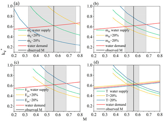 The value of M* varies with several meteorological parameters, including the rainfall event depth (), mean time between precipitation (), potential evapotranspiration of wet soil (), and temperature (T) (Figure 7). Overall, M* is most sensitive to , with which it exhibits a positive correlation. When increases (decreases) by 20%, M* increases (decreases) by 35.56% (41.17%). Furthermore, as increases (decreases), the water supply curve shifts upward (downward). However, the water demand curve remains unchanged regardless of variations in . Characteristically, M* is negatively correlated with ; when increases (decreases) by 20%, M* decreases (increases) by 14.11% (20.35%). When increases and decreases, the water supply curve shifts downward and upward, respectively, whereas the water demand curve remains unchanged. Additionally, M* is also negatively correlated with . When increases (decreases) by 20%, the water supply curve shifts downward (upward), resulting in a decrease (increase) in M* of 14.32% (20.12%). Changes in , , and lead to changes in the water supply curve, whereas changes in T lead to changes in the water supply and water demand curves. When T increases by 20%, the water supply curve shifts downward and the water demand curve shifts upward, resulting in a decrease in M* of 10.72%. In contrast, when T decreases by 20%, M* increases by 8.70%. It is noted that M* is the least sensitive to T (Table 3).