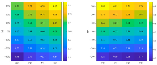 Climate change leads to variations in both M and M*, with M varying between 0.48 and 0.82 and M* varying between 0.21 and 0.85. When the rainfall remains constant, an increase in T results in an increase in M. For a 1 °C rise in T, M increases by 4.11%; for a 2 °C rise, M increases by 6.24%; and for a 3 °C rise, M increases by 10.60%. Conversely, for a rise in T of 1, 2, and 3 °C, there is decrease in M* from 0.53 to 0.51 and finally to 0.49, respectively. With a constant value of T, M or M* increases as the rainfall increases. For example, M* rises from 0.56 to 0.85 when the rainfall increases by 30%; similarly, M rises from 0.62 to 0.71. When there is decrease in the rainfall, the sensitivity to climate change of M* is notably higher than that of M. For example, M* reduces from 0.56 to 0.21 as the rainfall declines by 30%; similarly, M reduces from 0.62 to 0.48.