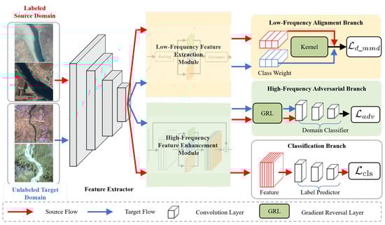 Inspired by the above phenomenon, in this paper, we propose the Frequency Component Adaptation Network (FCAN) for cross-domain scene classification for remote sensing, which refines the feature representation and separates the low-frequency feature components and high-frequency feature components. Specifically, our proposed method consists of a high-frequency feature branch, a low-frequency feature branch and a classification branch. For the high-frequency branch, a high-frequency feature enhancement module (HFE) is first used for the source and target domains, and the source domain’s high-frequency features are supervised with category labeling information, while the high-frequency features of the source and target domains, both of which are trained adversarially, are supervised with domain labeling information. For the low-frequency branch, a dynamic maximum mean discrepancy (DMMD) loss is used for the distribution alignment of the source domain’s low-frequency features and the target domain’s low-frequency features extracted by the low-frequency feature extraction module (LFE).