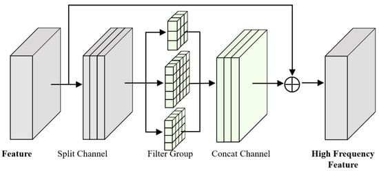 As mentioned earlier, the high-frequency components contain information about the characteristics of the distribution of the data, and utilizing the high-frequency components can boost the CNN’s performance. In order to extract different frequency features, previous work [] proposed a method based on the Fourier transform and the inverse Fourier transform. However, this approach imposed an additional computational overhead, limiting its use on hardware. We refer to article [] for a purely convolutional design that avoids the introduction of the Fourier transform. We propose a high-frequency feature enhancement module, and the structure of the HFE module is shown in Figure 3.