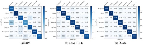 Figure 6 shows the confusion matrix of the three methods of ERM, ERM with the introduction of high-frequency feature-enhanced branching, and the full FCAN on the R→A task. It can be observed that the diagonal elements of the confusion matrix are gradually concentrated and deepen in color, which further validates the effectiveness of our algorithm. For the categories “Farmland” and “Meadow”, which are visually very similar, ERM has difficulty distinguishing between these two categories. Our high-frequency feature branch can effectively reduce the confusion between the two categories and achieve more accurate cross-scene classification.