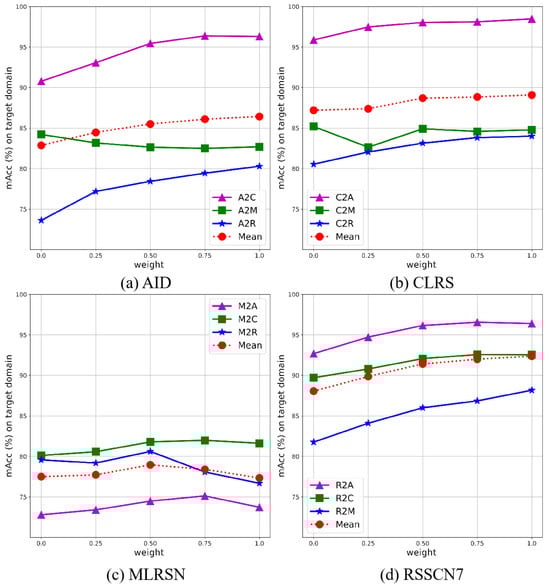 In terms of individual tasks, the biggest improvement is on the R→M task, with an improvement of 25.87%. The smallest improvement is M→A, which is only improved by 0.92%. As far as the source domain is concerned, using AID, CLRS, MLRSN4 and RSSCN7 as the source domain, the average accuracy improvement is 8.48%, 8.68%, 10.43% and 18.41%, respectively, and RSSCN7 has the largest improvement, which is explained by the fact that RSSCN7 contains four sizes of data, which contain more variations compared to the other three datasets, and the diversity of the sample sizes is more helpful in realizing knowledge transfer. As far as the target domain is concerned, the average accuracy improvement with AID, CLRS, MLRSN and RSSCN7 as the target domain is 6.03%, 12.08%, 14.82% and 13.07%, respectively. AID has the smallest improvement, which is believed to be due to the fact that AID has a single source of data, and also since the sample size of AID is much smaller compared to several other datasets, other data may contain patterns from AID, making transfer easier to achieve.