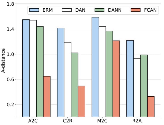 Distribution Discrepancy. We also analyze the ability of different models to reduce the domain gap. -Distance [] is a metric that estimates the variability between different distributions. It is calculated as , which additionally defines a classifier for binary classification of source and target domain data, and is the generalization error of this classifier. Specifically, after training the model, we obtain the source domain features and the target domain features and then use them as samples to train a single-layer linear classifier, and the classification error rate is taken as . A large means a large generalization error. Figure 8 shows the -Distance results of the four methods, ERM, DAN, DANN and FCAN, on the four tasks. As can be seen, our proposed FCAN method has the smallest a-distance on multiple tasks, which means that FCAN is more capable of bridging domain differences compared to other methods.