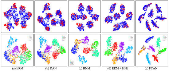 Visualization of feature distribution. To further demonstrate the effectiveness of the FCAN, we visualize the features learned by different models before the classifiers using the T-SNE method [] for the task R→C. These comparisons include longitudinal comparison methods such as DAN and BNM, as well as horizontal comparison methods such as ERM, the ERM with added high-frequency branches, and our full FCAN. Notably, we performed two different feature visualization comparisons, as shown in Figure 9, where the first row shows domain-wise comparisons, with blue scatters representing the features of the source domain samples and red scatters representing the features of the target domain samples. This assesses the generalization ability of different methods. The second row shows class-wise comparisons, with different colors representing the features of different classes of samples. This assesses the discriminative ability of different methods.
