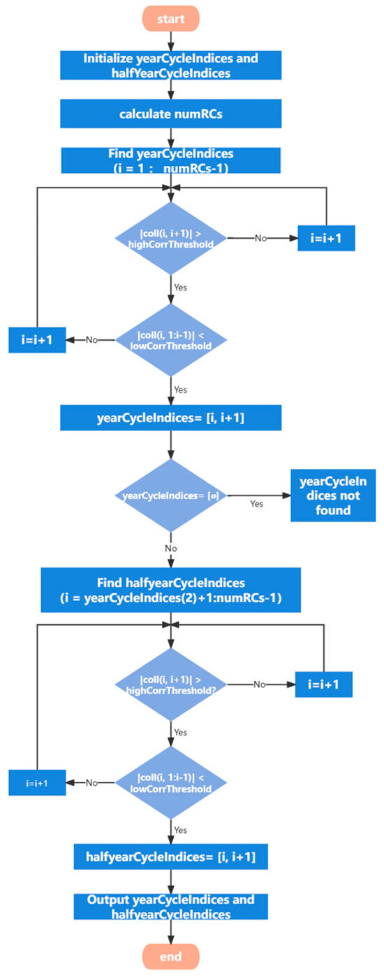 We have improved the reconstruction RC’s ability to find the cycle term by adding the function of automatically finding the annual and semi-annual cycles. This is based on the principle whereby the annual and semi-annual cycles are automatically recognizing by analysis of the correlation of the cycle pairs, by avoiding the subjective selection of a human, and, at the same time, by improving the efficiency. The function’s process is shown in Figure 1.