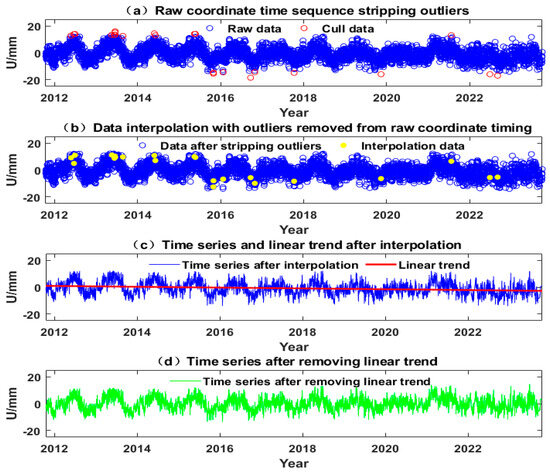 It is common practice to extract CME from residual time series, which are the time series obtained by excluding outliers from the original coordinate time series, interpolating, correcting the step terms, and removing the trend and seasonal terms. GPS residual time series can usually be expressed using Equation (14) [31]: