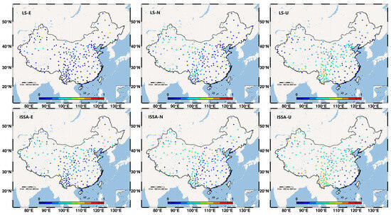 Figure 8 illustrates the magnitude of the goodness of fit R2 for each station in this GPS network when fitting the seasonal term in different directions using the two methods. Both methods show that the U direction fit is better than the N direction fit, which is in turn better than the E direction fit, and the ISSA fit is better than the LS fit in each direction. In the E direction, only 1.62% of sites with LS fitting period were fitted better (>0.40), and Chuandian region was fitted worse; 11.34% of sites with ISSA fitting period were fitted better (>0.40), and Chuandian region was fitted worse. In the N direction, only 6.07% of the sites with LS fitting seasonal term were fitted better (>0.40), with poorer fits in southern and northern China, and 26.72% of the sites with ISSA fitting seasonal term were fitted better (>0.40), with poorer fits in southern and northern China. In the U direction, 24.29% of the sites had a better LS fit period (>0.40), with the best fit in Chuandian region and the worst in the southeast coast, and 44.94% of the sites had a better ISSA fit period (>0.40), with the best fit in Chuandian region and the worst in the southeast coast. Overall, the ISSA fit is better than the LS fit, and therefore ISSA is considered more suitable for fitting seasonal terms to the time series of site coordinates in this study area.