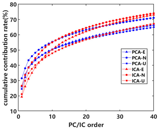 Cumulative contribution of PC/IC in the first 40 orders in the N, E, and U directions.