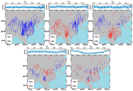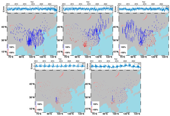 Unlike PCA, ICA, as a blind source signal separation method, can decompose the mixed signal into multiple independent signals and maximize the non-Gaussian components to separate the anomalous signal into independent components. The SR of the first five ICs of the E, N, and U components are shown in Figure 14, Figure 15 and Figure 16, where SR is the result after normalization, and the response value with the largest absolute value is 100%, with blue arrows pointing up to indicate a positive response, and red arrows pointing down to indicate a negative response. According to the definition of CME proposed by Dong et al. [13], it is calculated that only IC1 satisfies its condition in the E direction, and both IC1 and IC2 satisfy their conditions in the N and U directions. As a result, CME is extracted using 247 stations, with IC1 in the E direction and with IC1 and IC2 in the N and U directions, respectively. The RMSEs of the residuals of the extracted CMEs in the E, N, and U directions are mean values that were reduced by 9.60%, 17.08%, and 16.14%, respectively. Meanwhile, according to the ICA-based definition of CME proposed by Ming et al. [15], it is considered that, if an IC has obvious spatial characteristics, then that IC is one of the source signals of the CME. Additionally, based on this definition and on Figure 14, Figure 15 and Figure 16, by using 247 stations in the E and U directions with IC1, IC2, and IC3 to extract CMEs, and by using IC1, IC2, IC3, and IC4 to extract CMEs in the N direction, the average residual RMSE values are reduced by 20.28%, 20.25%, and 25.56%, respectively. Based on these two CME definitions and the results of PCA and ICA, the CME definition and ICA proposed by Ming et al. [15] are more suitable for the extraction of CMEs from the CMONOC II observation network.