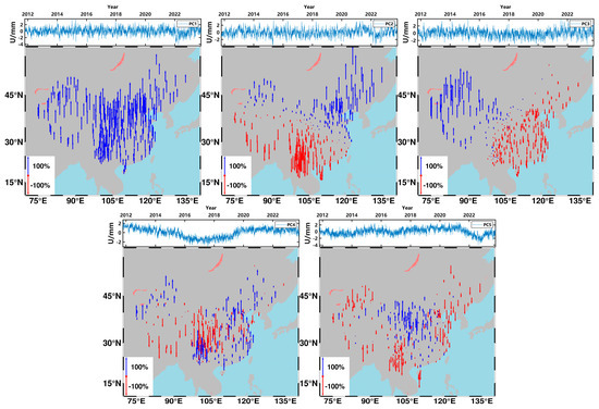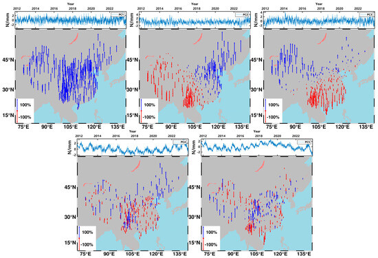 For the SR results, we find that the SR1 of the E component (Figure 14) shows spatial coherence, with larger sizes observed in the center and east and smaller sizes observed in the northeast and west. The SR2 and SR3 show obvious NE–SW or NW–SE asymmetric distributions with respectively opposing signs. SR2 and SR3 show obvious northeast–southwest or northwest–southeast asymmetric distributions with opposite signs, and the sizes of the SRs of the above two modes are smaller at the intersection of the positive and negative regions and larger at the edges, which indicates that there exists a smooth transition zone between the positive and negative regions. SR4 and SR5 indicate that there may be anomalous stations, and that all of these are located in Chuandian region, possibly due to the fact that the signals of some of the stations are affected by the local environment. For the N component (Figure 15), SR1 and SR2 show relatively consistent spatial distributions and the spatial response values in Chuandian region are slightly higher than those in other regions. SR3 is consistent with the spatial distribution of SR2 for the E component, showing an obvious northeast–southwest incomplete symmetrical distribution with opposite signs. SR4 shows an obvious south–north incomplete symmetric distribution with opposite signs, and there is a smooth transition zone between the positive and negative regions of the SRs of the above two modes. SR5 does not show obvious spatial distribution characteristics and local features. For the U component (Figure 16), SR1 is spatially consistent, with the magnitude of SR being smaller in the west and larger in the central east and northeast. SR2 shows a gradual decrease in SR from north to south, with negative responses in Chuandian region, and part of south China. SR3 shows a clear northeast–southwest asymmetric distribution with opposite signs, with the size of SR being smaller at the intersection of positive and negative regions and larger at the edges and with a smooth transition between positive and negative regions. SR2 shows a gradual decrease in SR from north to south, with some areas in Chuandian and South China showing a negative response. SR3 shows an obvious asymmetric distribution from northeast to southwest with opposite signs, with the size of SR being smaller at the intersection of the positive and negative regions and larger at the edges and with a smooth transition zone between the positive and negative regions. SR4 does not show an obvious spatial distribution at all, but local areas will show spatial consistency; for example, Chuandian, eastern South China, Tibetan Plateau, and Xiyu region show spatially positive responses, while most of the stations in northeast China, east North China, Gansu’s surrounding areas, and South Qinghai–Tibet show spatially negative responses. In SR5, the overall spatial distribution also does not show obvious characteristics, but most of the stations in different areas show spatial consistency, with most of the stations in Northeast China, North China, South China, and the Tibetan Plateau showing spatially negative responses, while most of the stations in Chuandian and western Xiyu show spatially positive responses.