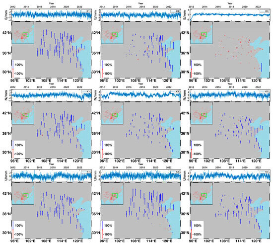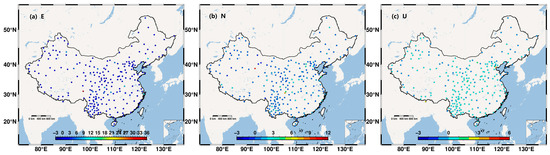We used the observation data from 260 benchmark stations of the Chinese Mainland Tectonic Environment Monitoring Network (Figure 2), and applied the GPS data post-processing and satellite positioning software GIPSY/OASIS6.0, developed by the Jet Propulsion Laboratory (JPL) of the National Aeronautics and Space Administration (NASA), and adopted the precision single-point positioning data processing strategy [30]. The CMONOC II reference station was rigorously processed on a daily basis to obtain the raw coordinate change time series of each station based on ITRF2020 (Figure 3). Among these, CMONOCII is a nationally integrated geoscience observation network for real-time monitoring and consists of more than 260 reference stations for continuous observation and more than 2000 regional stations for irregular observation. The spatial scale of CMONOCII is about 5000 km, which can be regarded as a large spatial scale, and at the same time accurately reflects the spatial distribution characteristics of CME. The principles of site selection are as follows: (1) the missing rate of site data is less than 20% and (2) the time series of site coordinates span more than 12 years and have high stability. We selected 247 stations in mainland China to form a large spatial scale GPS network, whose time span is from October 2011 to October 2023, and the average missing rate of station data is 4.79%, indicating that it has less of an influence on the experimental results.
