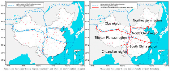 Prior research results have shown that the results of regional filtering in small spatial scales are better than those in large spatial scales, but that there is no uniform division standard. For the spatial distribution characteristics of the CMEs shown in the above experiments and for the modern tectonic deformation of the Chinese continent, mainly characterized by tectonic block regions that have active tectonic blocks and, as pointed out by Zhang et al., the relatively uniform movement mode of its geologic unit [29], this paper proposes to divide subregions in accordance with the first-level active tectonic block regions. The active tectonic blocks proposed by Zhang et al. [29] in mainland China are shown in Figure 17a. Here, some stations of the CMONOC II observation network are located in the junction region of two or more tectonic block regions, such as BJSH, BJYQ, NMBT, NMTK, TJBD, and TJBH between the northeast active tectonic block region and the North China active tectonic block region. To this we might add the stations of GSJN and GSDX, which are located in the North China active tectonic block region, the South China active tectonic block region, and the Tibetan Plateau active tectonic block region. We refined the boundaries of the active tectonic block region in mainland China by calculating the spatial response values of the site using ICA and its neighboring tectonic block region. For example, the NXYC site is located between the North China tectonic block region and the Xiyu active tectonic block region, and the spatial responses of the NXYC site in the North China active tectonic block region in the three directions of E, N, and U are calculated to be 67.18%, 51.56%, and 73.99%, respectively, while the spatial responses of the NXYC site in the Xiyu active tectonic block region in the three directions of E, N, and U are 0.65%, 42.82%, and 21.38%, respectively. After comparing the spatial responses of the NXYC site in all three directions in the North China active tectonic block region, we found them to be greater than the spatial responses in the Xiyu active tectonic block region. This indicates that the NXYC site should be assigned to the North China active tectonic block region. The results of the spatial response calculation of some sites are shown in Table 2, and all inter-plot sites are classified into adjacent plots according to the size of the spatial response value with the adjacent plots. The first-level active tectonic-block region of the Chinese mainland is shown in Figure 17b, after the refinement of the determination. Here, the Chinese mainland is divided into six regions, namely, Chuandian, Northeastern, Northern China, Southern China, Tibetan Plateau, and Xiyu.