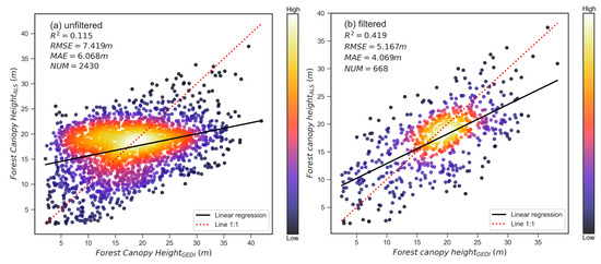 Scatter plot between forest height extracted using GEDIL2A and canopy height extracted using airborne LiDAR. (a) GEDI data without parameter filtering. (b) GEDIL2A data filtered with parameters.