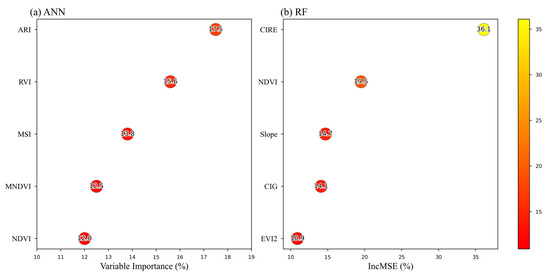 The graphs of feature importance analysis of the artificial neural network model and RF model. (a) Graph shows the result of feature importance of the ANN model, and (b) graph shows the result of feature importance of the RF model.