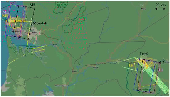 TanDEM-X scenes intersecting the lidar flights over Mondah and Lopé forests, overlaid with Open Street Map. Colour polygons identify different TanDEM-X acquisition extents.