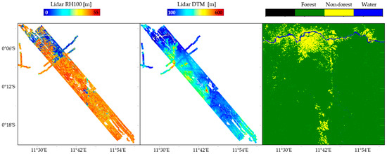 Lidar full waveform data were collected during the AfriSAR2016 campaign in February 2016 by NASA’s LVIS airborne lidar configuration. The footprints of LVIS returns range from 18 to 22 m, and the waveforms were resampled to a regular 20 m × 20 m grid with corresponding RH100 and DTM models provided by [8] and shown in Figure 2 and Figure 3.