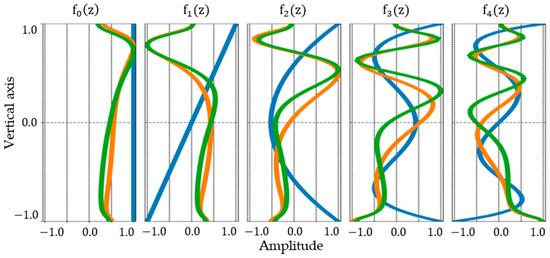 From left to right: basis function of zeroth to fourth order for Legendre (Blue), Mondah lidar eigen-profile basis (Orange), Lopé lidar eigen-profile basis (Green).