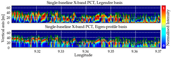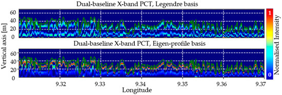 In this context, Polarisation Coherence Tomography (PCT) was proposed as an attractive alternative approach for the reconstruction of 3D radar reflectivity of volume scatterers from a small set of, even single, interferometric coherence measurements [20,21,22,23,24,25]. PCT expresses the vertical reflectivity profile as a series expansion in a given set of basis functions assuming prior knowledge of forest height and ground terrain elevation. The expansion coefficients are estimated from the interferometric coherence measurements.