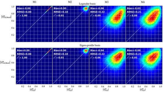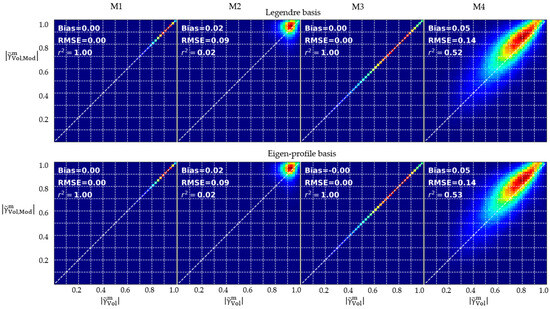 Mondah forest. Correlation histograms between measured and modelled volumetric decorrelation using dual-baseline PCT vertical reflectivity profile with Legendre (top row) and eigen-profile basis (bottom row). From left to right are TanDEM-X acquisitions: M1–M4. Acquisitions M1 and M3 were used to reconstruct the dual-baseline vertical reflectivity profiles.
